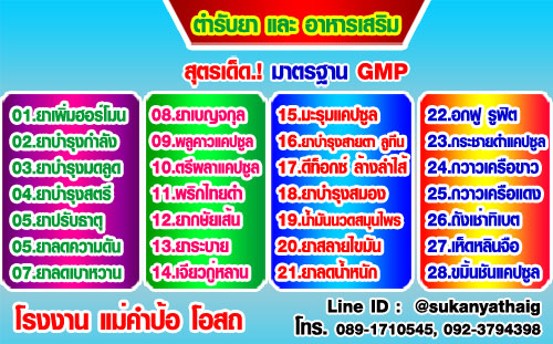 โรงงานสมุนไพรแม่คำป้อ โอสถ ได้รับใบอนุญาตผลิตยาแผนไทยหรือที่เรียกกันว่ายาแผนโบราณ ได้มาตรฐานกระทรวงสาธารณสุข สำนักคณะกรรมการอาหารและยา เราผลิตยาหลายตำรับหลายสูตรยา หนึ่งในนั้นมีสูตรเด็ดสูตรที่ขายดี กินแล้วได้ผลเป็นที่พอใจ ลูกค้าซื้อไปรับประทานแล้วต้องกลับกลับมาซื้อกินใหม่ สูตรยากวาวเครือแดงผสมสมุนไพรบำรุงร่างกาย ยาบำรุงกำลังแก้อ่อนเพลียสำหรับผู้ชาย โรงงานเราผลิตยาตำรับนี้ขายมาเป็นระยะเวลานานนับสิบปี วันนี้เปิดโอกาสให้ลูกค้าที่ต้องการทำธุรกิจขายสมุนไพรอาหารเสริม ซึ่งเป็นเทรนด์ที่กำลังมาแรงสำหรับคนที่เริ่มหันมาสนใจอยากทำธุรกิจด้านสุขภาพ ปัจจุบันคนหันมากินยาสมุนไพรมากขึ้น ตลาดกว้างใหญ่มีโอกาสทำตลาดได้ดี โรงงานเราพร้อมผลิตสร้างแบรนด์ให้ท่าน รับประกันเรื่องคุณภาพและราคาถูกและดีที่สุดในการรับผลิตยาอาหารเสริม